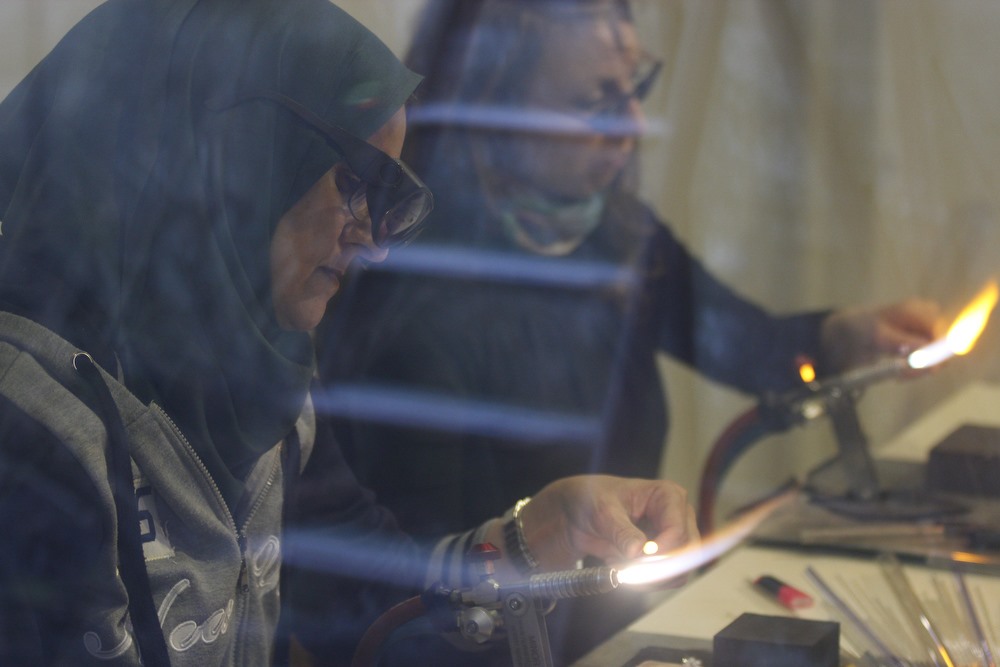 در استودیو ما سه مشعل داریم. شکل دادن و دمیدن شیشه روی مشعل نیاز به تمرکز و تمرکز بالایی دارد. هنگامی که مهارت به دست آمد و به کمال رسید، فرآیند تولید اشیای کوچک نسبتاً سریع است. ما بیشتر زیورآلات شیشه ای و سایر وسایل تزئینی می سازیم که اکنون در حال ترکیب با رسانه های دیگر هستیم. ما از طریق این فرآیند خلاقانه رشد و توسعه می یابیم.