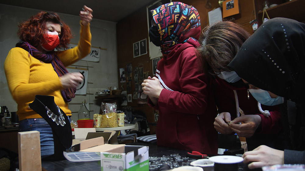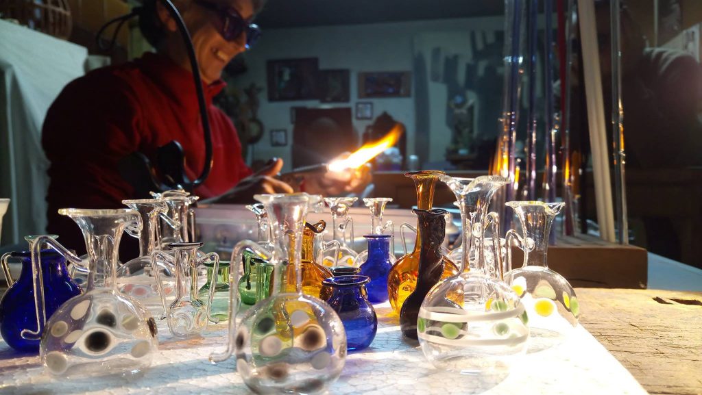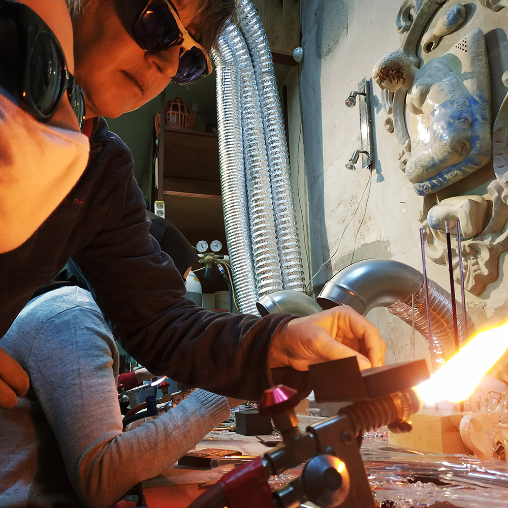 در استودیو ما سه مشعل داریم. شکل دادن و دمیدن شیشه روی مشعل نیاز به تمرکز و تمرکز بالایی دارد. هنگامی که مهارت به دست آمد و به کمال رسید، فرآیند تولید اشیای کوچک نسبتاً سریع است. ما بیشتر زیورآلات شیشه ای و سایر وسایل تزئینی می سازیم که اکنون در حال ترکیب با رسانه های دیگر هستیم. ما از طریق این فرآیند خلاقانه رشد و توسعه می یابیم.